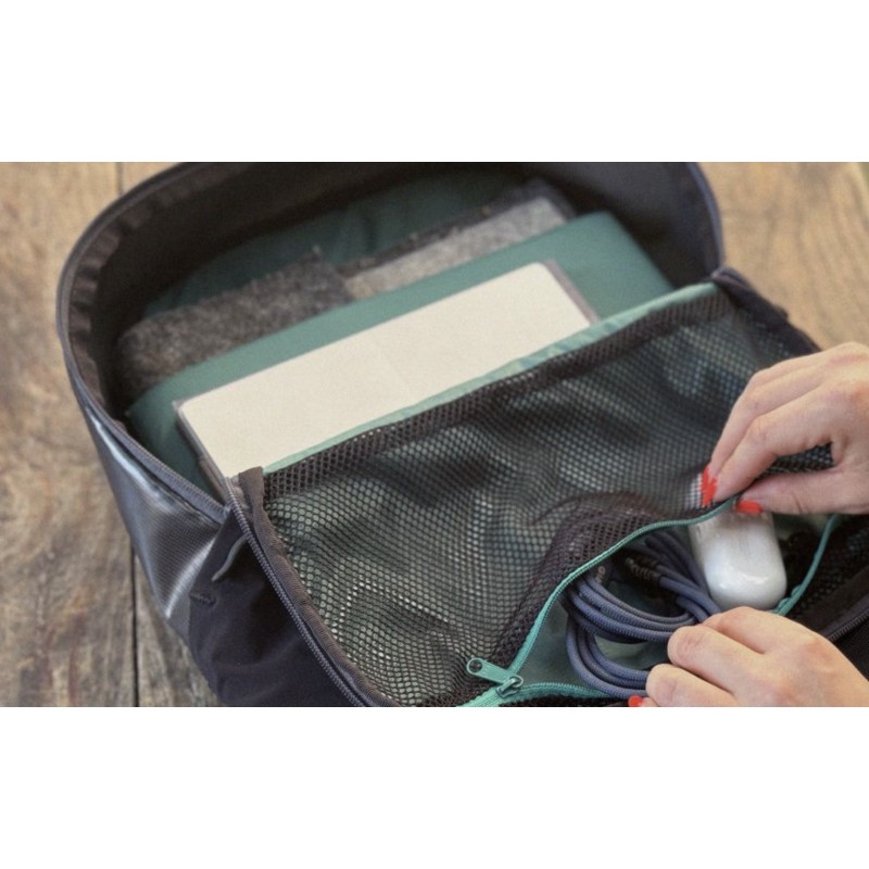 Er besteht aus P600 TPU-Material auf der Außenseite, für außergewöhnliche Haltbarkeit und D70 für die Innentaschen, damit bleibt er gleichzeitig schön leicht. Der obere und untere Teil des Rucksacks sind wasserdicht, so dass deine Sachen jederzeit geschützt sind.